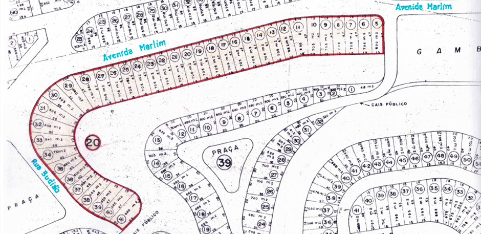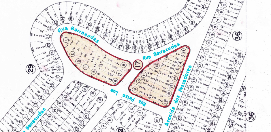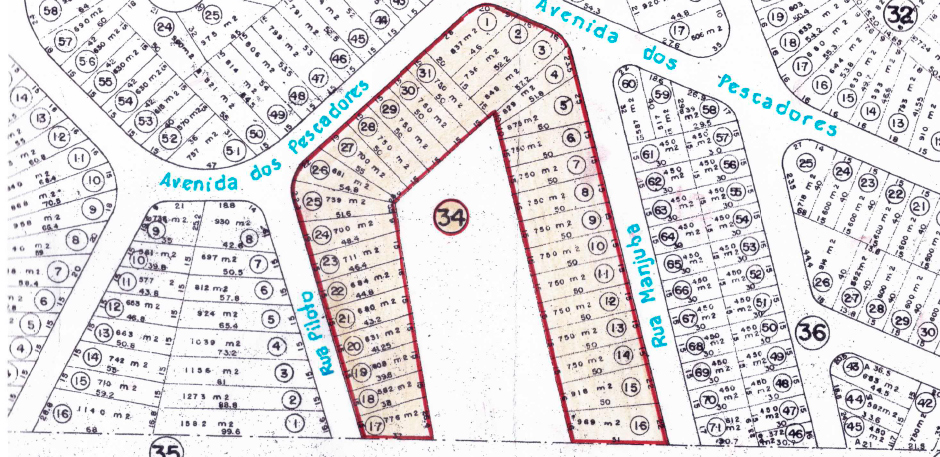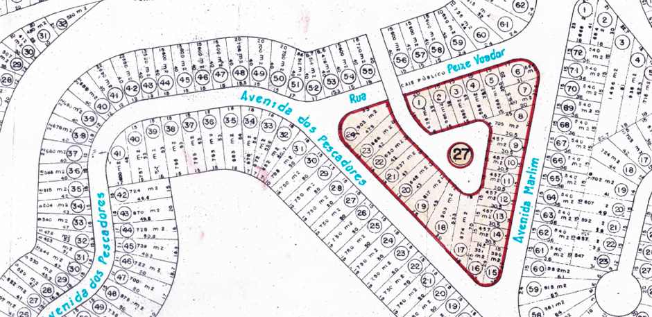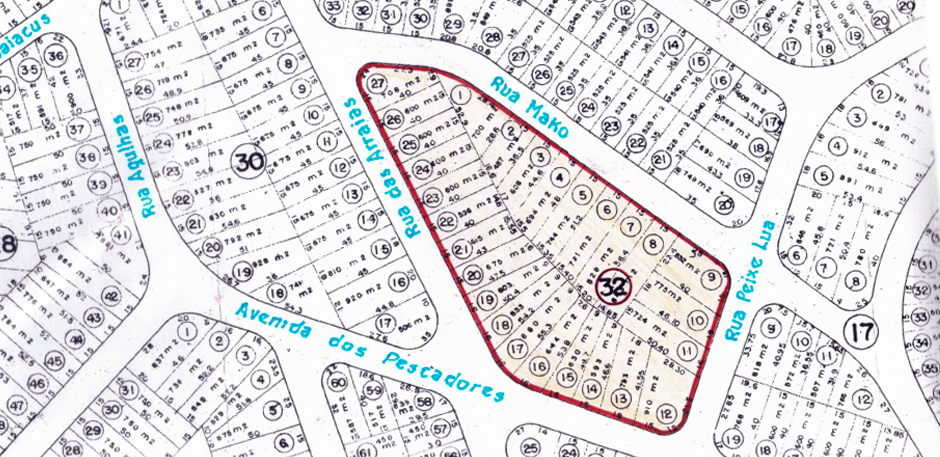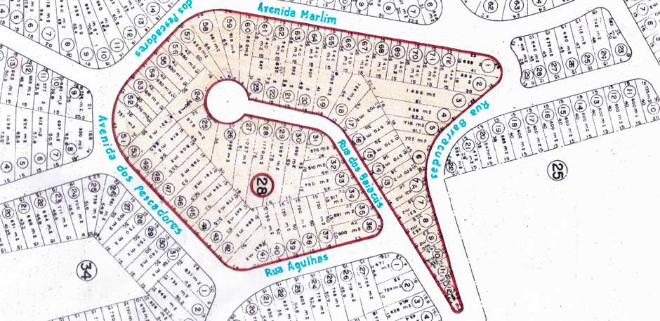 Formada por três blocos e vinte e nove lotes, assim se descreve: um bloco contendo nove lotes (1 e 9) de frente oara a Rua das Garoupas e fundos para um terreno alagado; um bloco contendo treze lotes (10 ao 22) de frente para as ruas Rombudos e Barracudas; um bloco contendo sete lotes (23 a 29) entre as ruas Garoupas, Rombudos e Avenida Marlim.